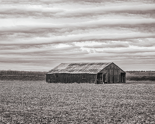 An old, weathered barn stands alone in an empty field under a sky filled with layered clouds. The monochromatic tones give the scene a nostalgic,... more