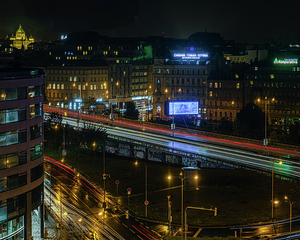 City lights glow against the night sky as traffic streaks through the streets, leaving trails of light. Buildings are illuminated, showcasing a... more