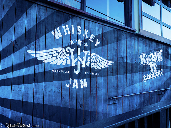 A mural featuring the text "Whiskey Jam" with winged letters and stars adorns the side of a wooden building. The design is accented with bold radiating lines, and a smaller logo reading "Kickin' It Coolers" appears on the right.