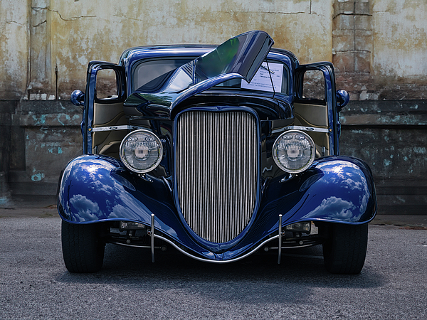 A classic car with a shiny dark blue finish is presented in front of an old wall. The vehicle has its hood opened, showcasing the engine, and features distinctive vintage design elements such as round headlights and a tall vertical grille.